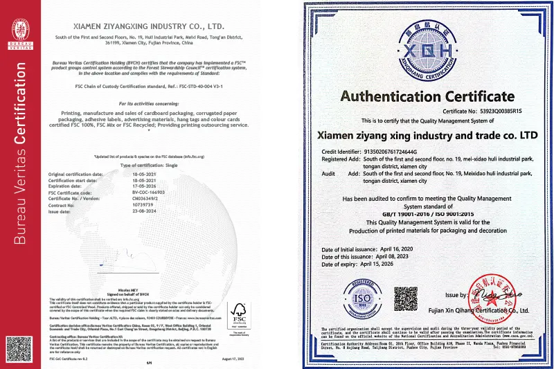 ج: لدينا FSC، وFDA، وSGS، وVOC، والامتثال للوائح البيئية مثل RoHS، و94/62/EC، وUS TPCH. مصنعنا حاصل على شهادة ISO9001، كمورد ومصدر رائد للتغليف الدولي.
